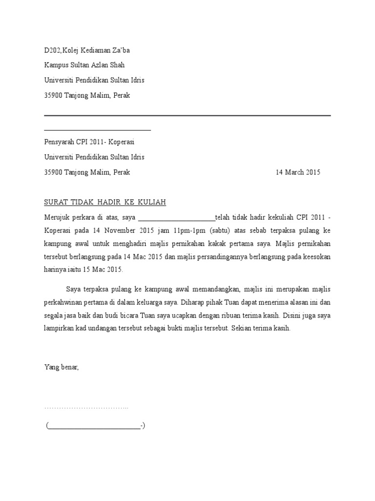 Contoh Surat Rasmi Tidak Hadir Ke Kuliah Universiti Kumpulan Contoh Terbaru